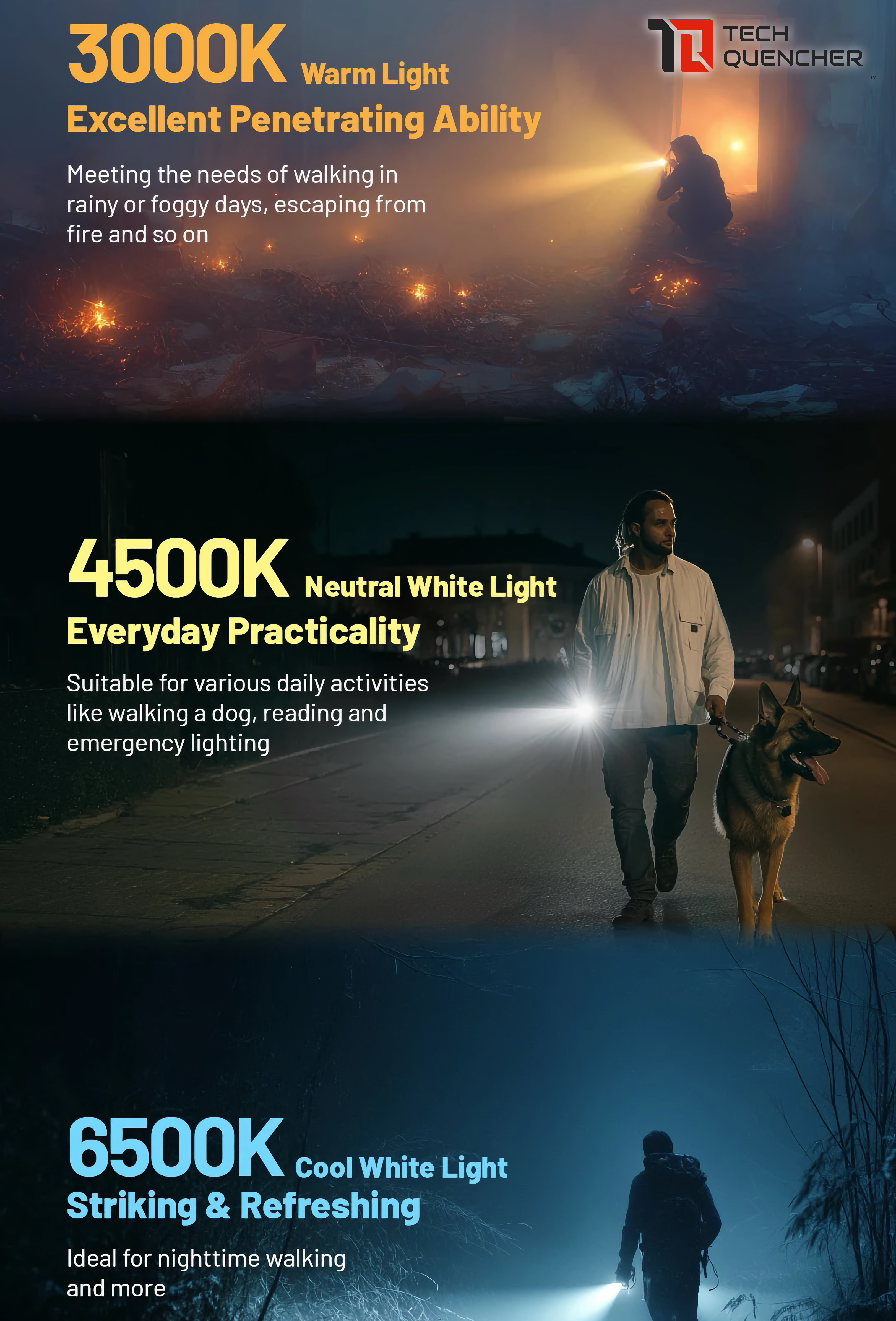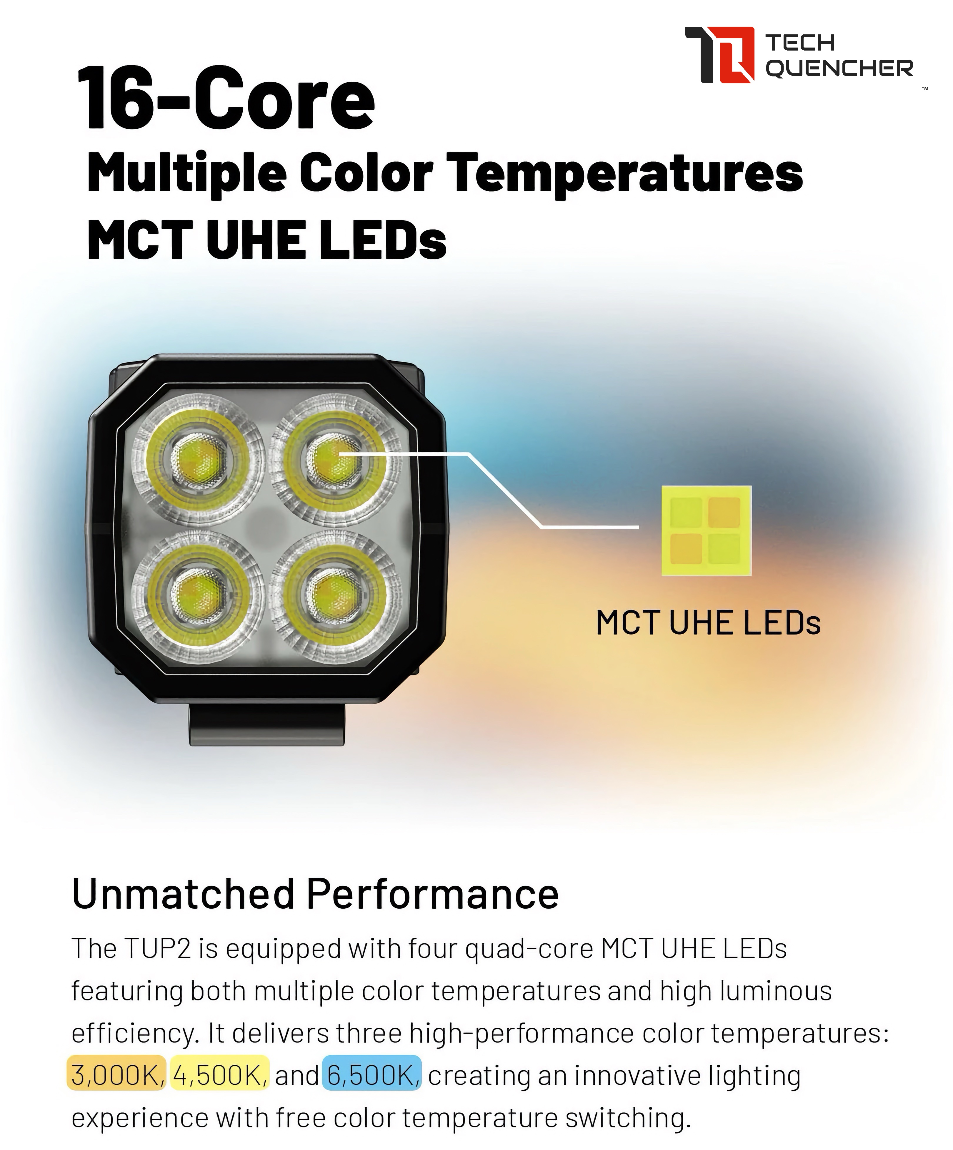 ***The TUP2 is equipped with four quad-core MCT UHE LEDs featuring both multiple color temperatures and high luminous efficiency. It delivers three high-performance color temperatures: 3,000K, 4,500K, and 6,500K, creating an innovative lighting experience with free color temperature switching. With 2-meter impact resistance and an IP54 rating, it easily adapts to various scenarios such as walking in the rain or fog, escaping from fire or walking a dog.
