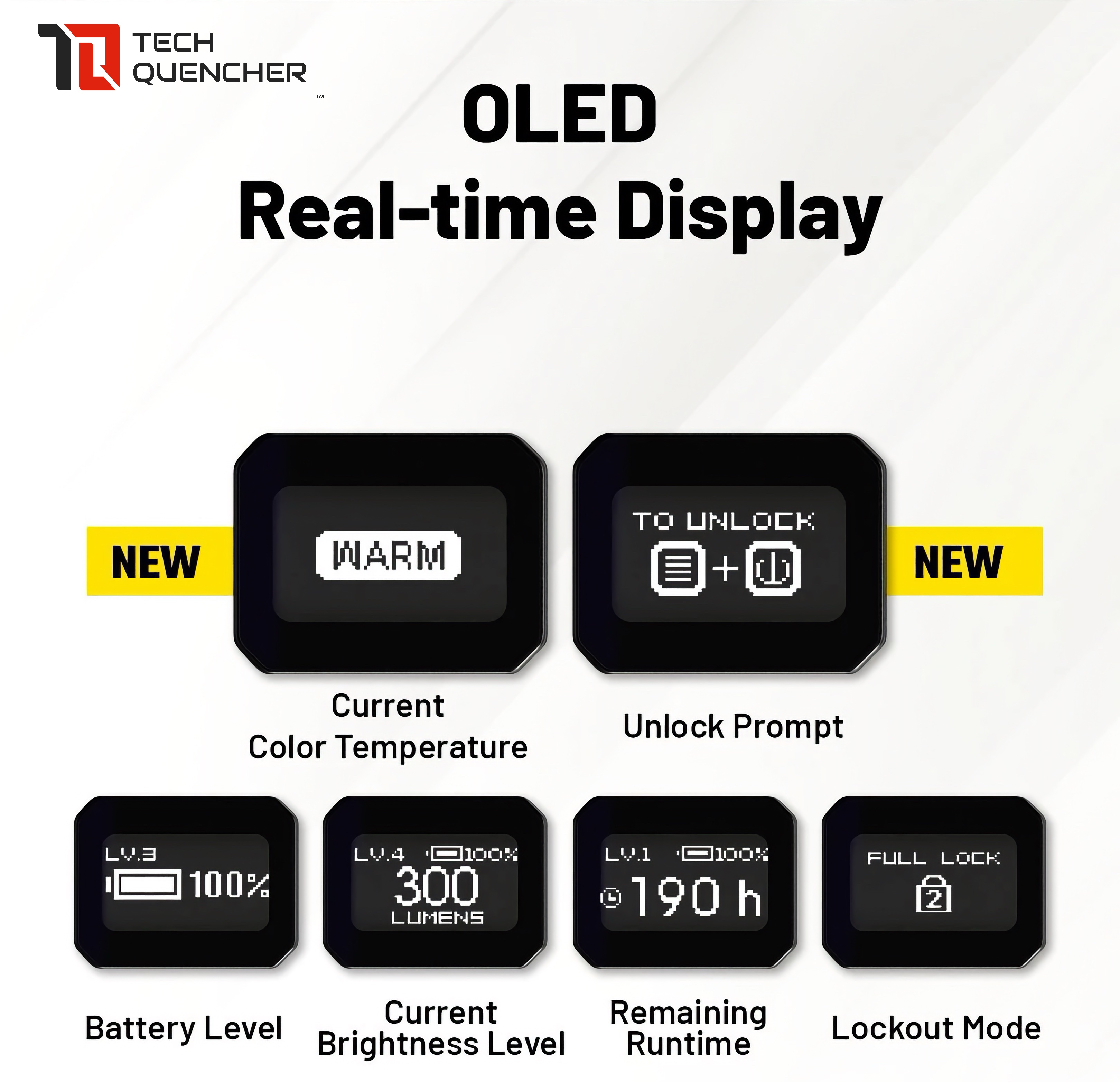 -Multifunctional OLED real-time display of lumens, battery level and runtime etc.